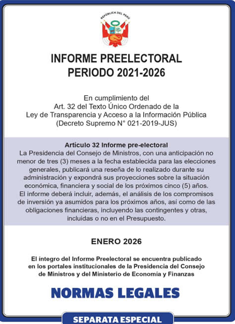 Informe Preelectoral. El Gobierno Transitorio de José Jeri publico este domingo 11 el Informe Preelectoral Periodo 2021-2026 en cumplimiento del Art. 32 del Texto Único Ordenado de la Ley de Transparencia y Acceso a la Información Pública que manda a la PCM a publicar el documento con una anticipación no menor de tres (3) meses a la fecha establecida para las elecciones generales.